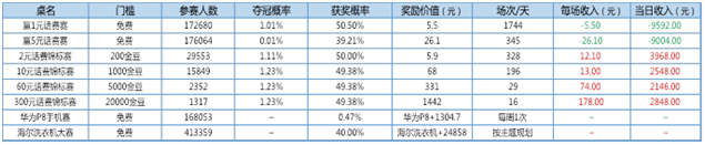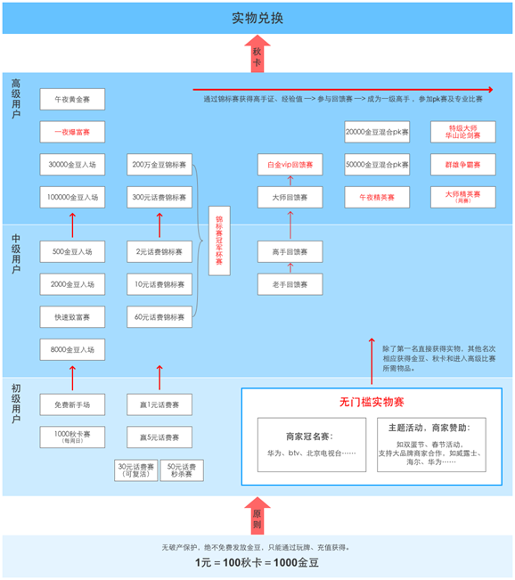 第一,游戏(xì)大部分的支出都在于(yú)金豆,而非秋(qiū)卡。金豆是参与比赛(sài)的消耗品,而秋卡才是能直接(jiē)进行(háng)实物兑换的。第(dì)二,系统仅支持秋(qiū)卡(kǎ)兑换成(chéng)金豆(dòu),不支持金豆兑换成(chéng)秋(qiū)卡,说明1000金豆等于(yú)100秋卡仅(jǐn)是一个假象(xiàng)。第三,支(zhī)出(chū)最大(dà)的(de)实物赛,如华为P8手机(jī)赛(sài)、海(hǎi)尔洗衣(yī)机大赛,用户参(cān)与门(mén)槛却为0,JJ斗地主(zhǔ)不可能付出大心(xīn)力(lì)为别(bié)的商家打广告,我们有理由认为,JJ斗地主转移了大半(bàn)成本(běn)到合作商处。
