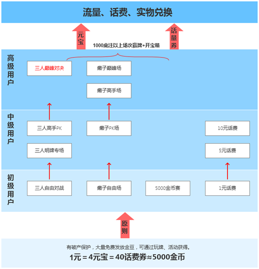 从充值上看(kàn),1元≈5000金(jīn)币;从兑换(huàn)上看,1元=4元宝(bǎo)=40话费券。但是博雅斗地主采用的是宽松(sōng)的经济(jì)体(tǐ)系,会通(tōng)过(guò)破产保(bǎo)护、签到(dào)、活动(dòng)等方式大(dà)量发送金(jīn)币,所以该表格仅能反映趋势。但已能发(fā)现(xiàn),在(zài)实物比赛(sài)场(chǎng)中,博雅斗地(dì)主完全依靠自己采购话费、流量(liàng)来做留存,成本由自己(jǐ)承担。只要获得一定(dìng)实物,用户对产品体验的容(róng)忍度(dù)很高。