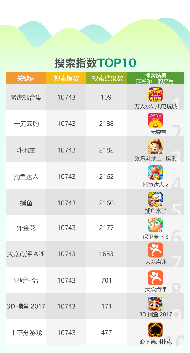 近(jìn)日,果搜大数(shù)据平台发布(bù)3月App store热搜报告。在(zài)国(guó)内榜(bǎng)单(dān)中,与(yǔ)去年一样,**棋牌类(lèi)应用(yòng),依然占据了热搜榜的半壁(bì)江山。天辰娱乐(微信公众号:wanghukeji)对此一点(diǎn)都(dōu)不感到意(yì)外,一是此类应用本(běn)身受众面就广,市场(chǎng)火热,再加上游戏厂商与刷(shuā)榜公司的“精诚合(hé)作(zuò)”,虽(suī)然可(kě)能(néng)具体的热搜词不同,但基本上都八九不(bú)离十(shí)。今天(tiān)扎(zhā)金花(huā),明天斗地主,后天就有可能是斗(dòu)牛(niú)了。真是铁打的棋牌,流水的热搜。