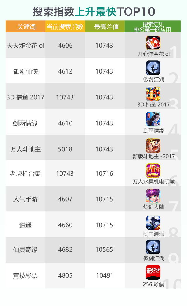 而在指数上升(shēng)最快(kuài)TOP10的榜单中,棋牌类关键词的表现也同样(yàng)不俗(sú),当然,也从中可以看得出有些应用的(de)排名,是与刷榜(bǎng)公司的(de)“精诚(chéng)合作”而得来的。