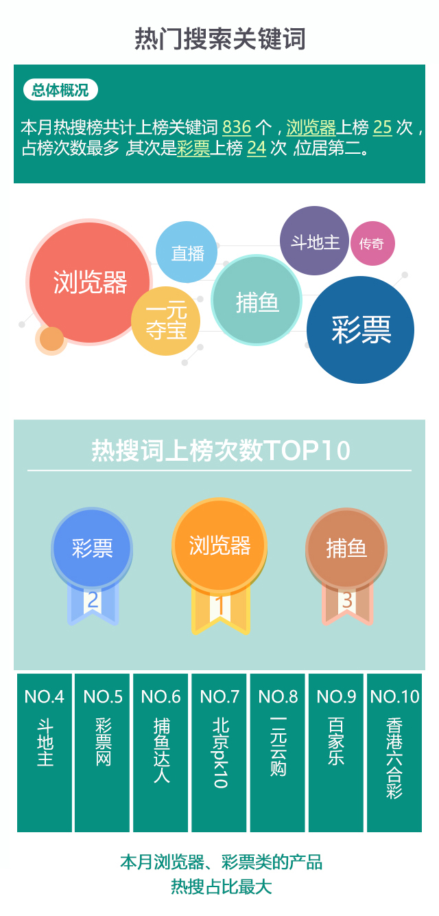 从上述榜单可以看出(chū),棋牌、捕(bǔ)鱼(yú)、街机类的关键词,占据了搜索指数(shù)TOP10中的6席,而所(suǒ)谓的一(yī)元(yuán)夺宝,也或多或少带有一些(xiē)**性(xìng)质。