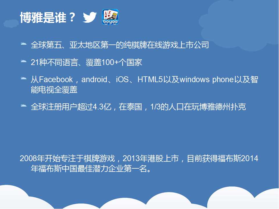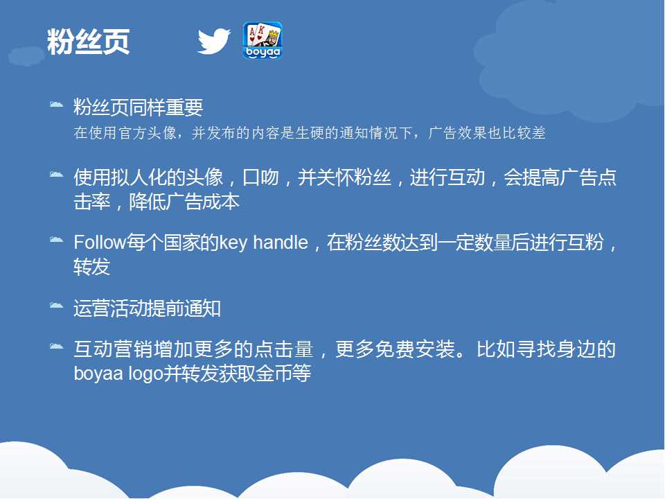 在这里(lǐ),天辰娱乐只想说(shuō),推广(guǎng)没有可以(yǐ)套用的(de)模板。每个人手中掌握(wò)的资源不一样(yàng),产品的特(tè)征(zhēng)不一样,所能做到的事情也就不一样(yàng)。推(tuī)广方案肯定是要结(jié)合自(zì)身实际来(lái)量身打(dǎ)造(zào)的,是要有数据累计(jì)的,同时也(yě)是有试错成本的。说(shuō)到这里,我们不妨来看看国内(nèi)一(yī)线(xiàn)厂商(shāng)博雅互(hù)动,是怎(zěn)么在推特(tè)上做推广的。希望(wàng)能给(gěi)广大运营商提供(gòng)一些推广思(sī)路(lù)。