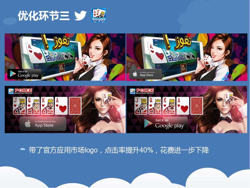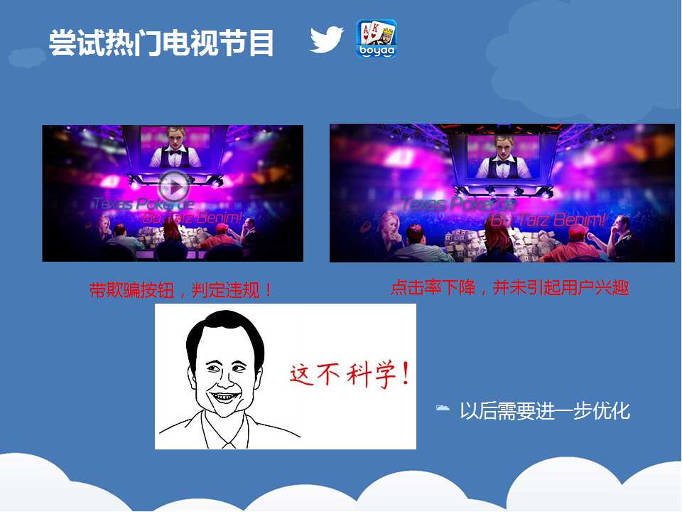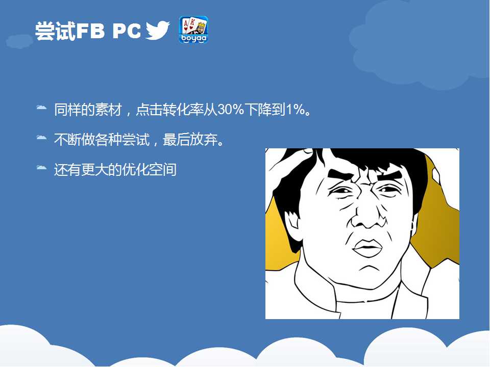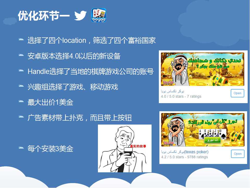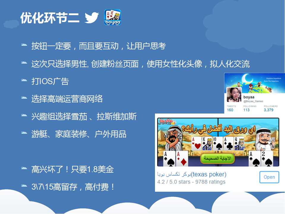一(yī)路看下(xià)来,我们(men)可以看出,博雅推(tuī)广的过程(chéng)其实就是一个(gè)不断优化(huà)的(de)过程,根据数据反馈及时调整推广(guǎng)策略,从而(ér)一步步降低推广成本的。所以,在(zài)推(tuī)广之前,弄清楚自己手中的筹码,以及如何(hé)将自己手(shǒu)中的筹码转化为更多的效(xiào)益。天辰娱乐科(kē)技致力于棋牌游戏开(kāi)发13年,拥(yōng)有大(dà)量开发运营经验和大批成(chéng)功案例(lì)。