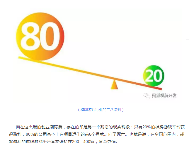 这个问题,其实刚刚(gāng)我已经侧(cè)面回答过了。胡穗(suì)华说:成(chéng)功(gōng)率当然大,不(bú)然不会有这么多新鲜血液入局(jú)。我刚(gāng)刚也说过,在房卡模式之前(qián),也同样有(yǒu)很多人从事(shì)地方棋牌游戏(xì)创(chuàng)业。从天辰娱乐(hú)统计的数据(jù)来看,那(nà)会个人创业者的成功率大概在1%-3%之间,可以(yǐ)说是非常低的。现在就不一样了,成(chéng)功率能达(dá)到20%—30%。在有些(xiē)地区甚至能达到50%。我们天辰娱乐之前在公众号发表了一篇文章(zhāng),专门描述了(le)这一现象,棋牌游戏行业的(de)“二(èr)八法则”。