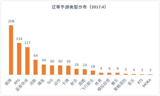 据天辰娱乐统(tǒng)计的数据,2017年4月,棋牌游戏类的手(shǒu)游过审数量为208款,远远高(gāo)出第(dì)二(èr)名RPG游戏的134款。其中还未(wèi)包括棋牌游戏的另一个分支——位于榜单第四的捕鱼游戏。若将捕鱼类游戏归入棋牌,其领先优势更是(shì)不可逾越的。