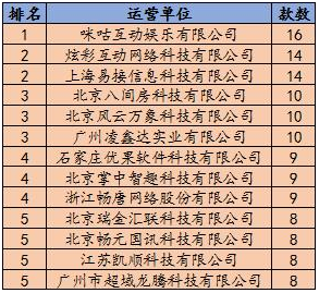 其中共有两家棋牌公司上(shàng)榜,分别为(wéi)位(wèi)于第(dì)二的炫彩互动网络科技有限公司(代表产品:中国(guó)游戏中心)和浙江(jiāng)畅唐网(wǎng)络股份有限公司(sī)(代表产品:同(tóng)城游)。