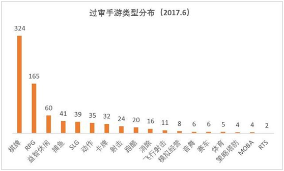从过审的(de)游戏(xì)类型上看,棋牌游戏(xì)毫无悬念的继续(xù)蝉(chán)联(lián)第一。而且相较(jiào)于五月(yuè)有(yǒu)较大的提升(shēng),几乎是后(hòu)四位过(guò)审游戏(xì)类型的总(zǒng)和(hé),达到324款。排在TOP5的分别是棋牌、RPG、益智休闲(xián)、捕鱼和SLG。