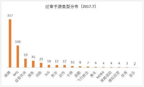 而从过审的游戏类型上(shàng)来看, 继6月份棋(qí)牌(pái)游戏数(shù)量(liàng)大增之(zhī)后,7月份该类型产品数量依(yī)旧居高不下。共计317款,虽然相较5月过审的(de)324款有些许下降,但仍(réng)然是(shì)一个可怕的存在。是排在第2位的(de)RPG游戏的两倍之多,且从占比来看,比6月份更(gèng)高。与此(cǐ)同时(shí),过审的捕鱼(yú)游戏数量也维持在第四名的(de)位(wèi)置,达到41款,相比(bǐ)6月下降了(le)4款。