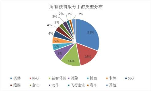 而如果我(wǒ)们将(jiāng)时间线拉长一(yī)点, 从2013年到2017年(nián),获得版(bǎn)号的手游类型(xíng)分布(bù)方面,棋(qí)牌类产品占比遥遥领先,高达31%。这是一个意(yì)料之(zhī)外(wài)却又意想之中的数据。毕竟(jìng)在很长一段时间(jiān)内,APP STORE畅销榜上(shàng)几乎有一般(bān)都(dōu)是棋牌(pái)游戏。而且(qiě)从广电审(shěn)核的角度来说,棋(qí)牌游戏(xì)大部分(fèn)玩法都(dōu)较为固定(dìng),游戏(xì)功能很少触碰过审(shěn)红线(xiàn),相对(duì)来说过审比(bǐ)较容易。实际(jì)上从2016年7月(yuè)开始,每个月都是棋牌类游戏过审数量最多(duō)。当(dāng)然,这与地方棋牌自去年下半(bàn)年开始在全国各地(dì)的爆发有(yǒu)关。