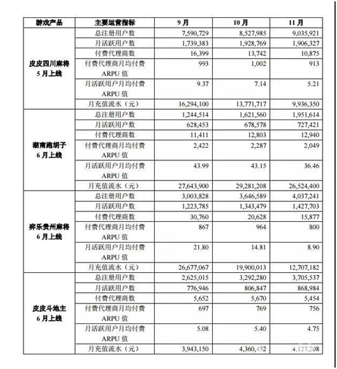 以(yǐ)乐玩网络为例,其自主研(yán)发了《皮皮四川麻将》、《湖南跑胡子》、《弈乐贵(guì)州麻将》和《皮皮斗地主(zhǔ)》等几(jǐ)款知名地方(fāng)棋牌游戏。公开资料显示(shì),乐玩网络(luò)2016年6-11月实(shí)现营(yíng)业收入2.82亿元,净利润(rùn)1.79亿(yì)元。其中,2016年5月上线(xiàn)的《皮皮四川麻将》收入9489.9万元(yuán),占比33.62%,其2016年9月(yuè)、10月、11月的月充值流水分别为1629.41万元、1377.17万元、993.64万(wàn)元。