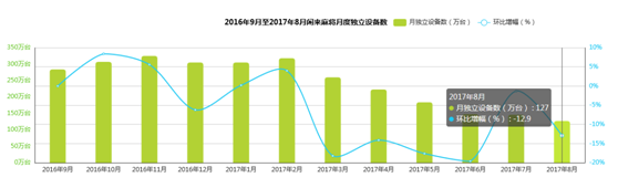 不(bú)过值得注意的(de)是,根据艾瑞咨询的(de)数据显示,自今年2月以来,闲来麻将(jiāng)的月度独(dú)立设备数一(yī)直呈下滑趋势,八月数据为127万台(tái),环比下降12.9%。这或许跟行(háng)业内不(bú)断出现的挑战者不无关系。
