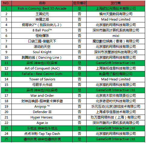台湾APP STORE排行榜前30中(zhōng)的棋牌博彩类游(yóu)戏