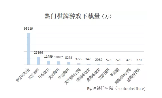 棋牌游戏市场参与者众(zhòng)多(duō),一个类型往往(wǎng)拥有(yǒu)多(duō)个同质游戏,在棋牌游戏市场中,由(yóu)腾(téng)讯、博雅(yǎ)、JJ、联众、途(tú)游等公司(sī)领(lǐng)头(tóu)。速(sù)途研究院统(tǒng)计360应用市场(chǎng)、应用(yòng)宝、豌豆荚和百度应用市场中(zhōng)几款(kuǎn)热门棋牌游戏的下载量。其中欢(huān)乐斗地主以96119万次下(xià)载量居于首位,这是腾讯(xùn)于(yú)2008年发布的收款实时(shí)对(duì)战棋牌游戏,用(yòng)户活跃度一直遥遥领先于其(qí)他同(tóng)类游戏;排(pái)在第(dì)二(èr)位的同样是由腾(téng)讯出(chū)品的(de)欢乐麻(má)将,但是其(qí)下(xià)载(zǎi)量与欢乐斗地主相比(bǐ),差(chà)距甚远。另外,在(zài)此次下载量(liàng)排行榜中,象棋和(hé)德州扑克(kè)的的成绩也相对较好。