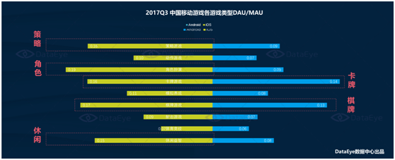 从手游的DAU(日活跃(yuè)玩家数量)MAU(月活(huó)跃玩家数量)的表现(xiàn)来看,卡牌、棋牌游戏在ioses和androids平台的活跃情况未出现较大差(chà)别,而策(cè)略、角色(sè)扮演(yǎn)、休闲益(yì)智游(yóu)戏,呈现出ioses高活、androids较(jiào)低活跃(yuè)的渠道差异(yì)表(biǎo)现。