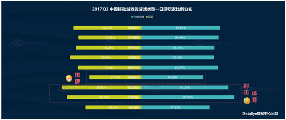 而(ér)把(bǎ)数据更细分地看的(de)话,我(wǒ)们可以看到棋牌游戏玩家的次日(rì)留存率是最好的。不管是androids还是ioses端“一日游”的(de)玩家占比都是最低的(de)。ioses平(píng)台为37.03%,androids平台为(wéi)43.69%。这在很大程度上(shàng)弥补了棋牌游戏付费率相(xiàng)较(jiào)其他游戏类型低的局面。