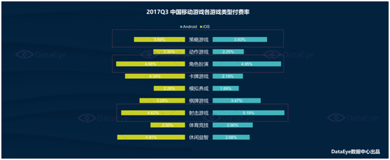 而如果把时间维度拉得更长(zhǎng)一些,我们能发(fā)现,棋牌游戏(xì)的优势会更明(míng)显。2017Q3,一(yī)日留(liú)存上ioses棋牌游戏留存排名第(dì)二34%,androids平台棋牌游戏留存最高30.83%;7日留存(cún)上棋牌游戏(xì)表现不俗,ioses和androids留存(cún)分别达到12.64%和10.25%是双料冠军;30日留存上(shàng),ioses平台棋牌(pái)游戏4.74%位居第(dì)三(sān),androids平台(tái)棋牌(pái)游戏4.32%居首。换句话说,棋牌游戏的(de)用户维护(hù)会比其他游戏类(lèi)型更好做(zuò)一(yī)些。