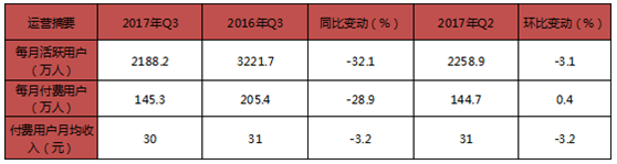 另(lìng)外,联众2017年(nián)第三季度的用户数据也不太(tài)理想(xiǎng),2017年Q3每月活跃用户2188.2万人,同比(bǐ)下降32.1%,环比下(xià)降3.1%;月付费(fèi)用户(hù)为(wéi)145.3万人,同比下(xià)降28.9%,环(huán)比增加0.4%;付费(fèi)用户(hù)月(yuè)均收入为30元,同比环(huán)比(bǐ)都(dōu)下降了3.2%。
