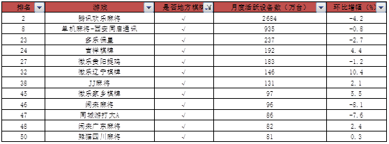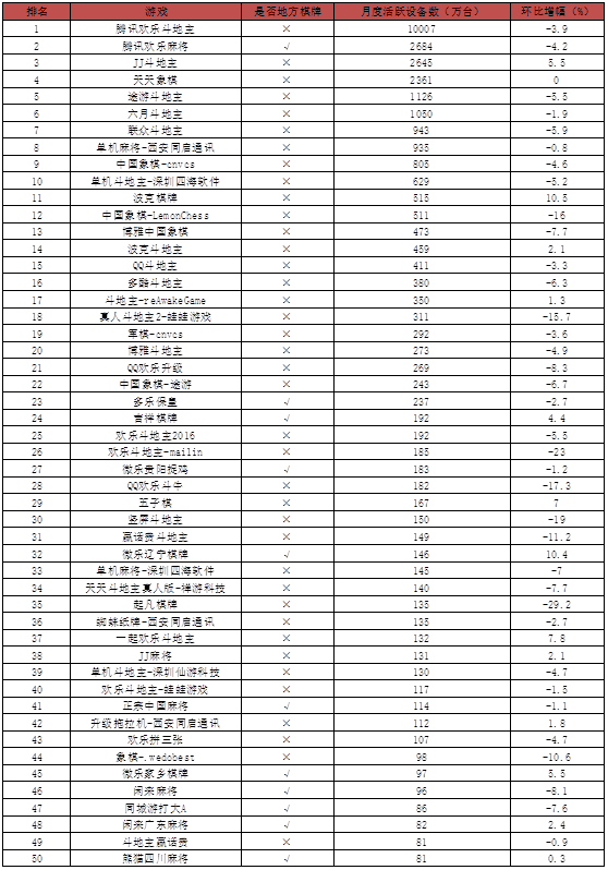 在前五十(shí)名的榜(bǎng)单中(zhōng),地方棋牌仅有12款,相较于10月份,新增两(liǎng)款地(dì)方棋牌游戏(xì)进入(rù)榜单,他(tā)们分别为(wéi):《腾讯欢乐麻将》、《单机麻(má)将》、《多乐保皇》、《吉(jí)祥棋牌》、《微乐贵(guì)阳捉鸡》、《微乐(lè)辽宁(níng)棋牌(pái)》、《JJ麻将》、《微乐家乡棋牌》、《闲(xián)来(lái)麻将》、《同城游打大A》、《闲来广东麻将》、《熊(xióng)猫四川麻将》。其中新(xīn)入榜单(dān)的两款地方(fāng)棋牌分别(bié)为:《闲来广东(dōng)麻将》、《熊猫四川(chuān)麻将》。
