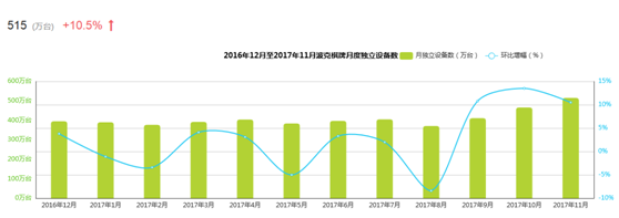 在11月份,通用型棋牌月度活跃设备数增长比例最高的游戏为《波克棋牌》,11月独立设备数达到(dào)515万台,增(zēng)长49万台,增长率高达10.5%,达到(dào)了全年的峰值。看(kàn)来波(bō)克城市(shì)的(de)“一亿品(pǐn)牌打造计划”效果还不(bú)错。