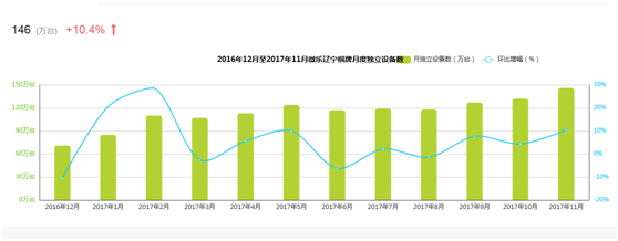 而地方棋牌月度活跃设备数增长比(bǐ)例(lì)最(zuì)高的游戏为《微乐辽宁棋牌》,11月独立设备数达到146万台,增长14万台,增长(zhǎng)率高达10.4%,在地方棋牌中(zhōng)是为数不多保(bǎo)持增长的游戏之一。