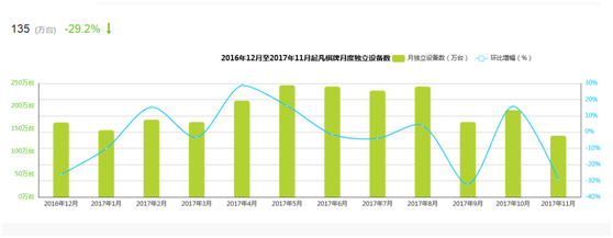 另(lìng)外(wài)值得注意的是, 11月前五十名棋牌游戏的榜单中,活跃设备数下降的比例高达72%,也就(jiù)是说36款(kuǎn)游戏是呈(chéng)下降趋势。其中降幅最大(dà)的(de)为《起凡棋牌(pái)》,11月独(dú)立设备数为135万台,下降56万台,下(xià)降(jiàng)比(bǐ)率(lǜ)为29.2%。