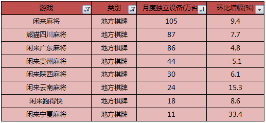 天辰娱乐(hú)在之(zhī)前的文章(zhāng)中曾介绍过,闲(xián)徕互娱旗下(xià)产品的数据在12月迎(yíng)来了绝地反击,主要8款地方棋牌产品有7款环比增长,其中《闲来宁夏麻(má)将》的增(zēng)幅(fú)更是达(dá)到(dào)33.4%,只有一款《闲(xián)来贵州麻将》的数据是(shì)下降的(de)。