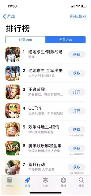 在(zài)这股(gǔ)风潮之下(xià),腾讯旗下两款棋牌游(yóu)戏(xì)《欢乐斗(dòu)地主》、《欢乐麻将全集》借(jiè)着春节的东风(fēng),App Store游戏免(miǎn)费榜上的排名大幅上涨,分别位列第五、第六名,甚至(zhì)一度超过网易“吃鸡”手游《荒野行动》。可见,在春节这一特(tè)殊(shū)的时间(jiān)点,上手门槛(kǎn)低、适合多人娱(yú)乐的棋牌游戏需求量(liàng)不可小觑。