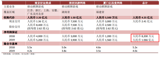 天辰娱乐在之前发布的文章(zhāng)中(zhōng)曾经介绍过,联众于 2018 年一(yī)月收购(gòu)三家地方棋牌游戏(xì)商,被收购方(fāng)保证 2018 年及(jí) 2019 年的总(zǒng)净利润将(jiāng)不低于(yú)人民币(bì) 8,200 万元及(jí)人民币 1.066 亿元。这(zhè)三家(jiā)游戏公(gōng)司(sī)分别在江浙沪、湖南和福建经营(yíng) 房(fáng)卡模式游戏,将为联众带来(lái)更高的利润率(毛利率为 50-60%),同(tóng)时也 弥补了其房卡(kǎ)模(mó)式(shì)游(yóu)戏短缺的不足。
