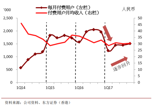 2017 年第 1 季(jì)度每月活跃(yuè)用户数量下跌,2017 年第 2 季(jì)度开(kāi)始(shǐ)缓(huǎn)慢(màn)回升