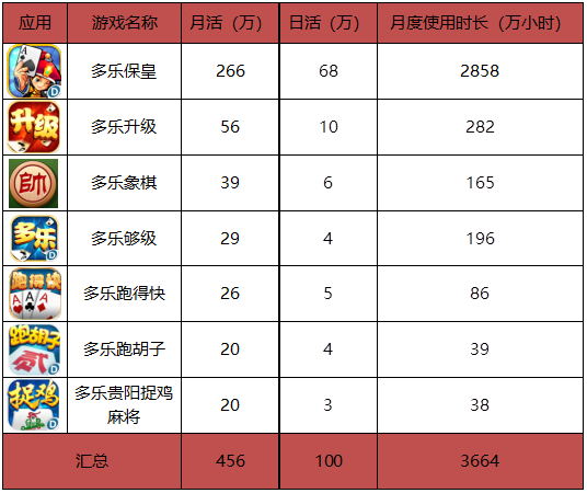 排(pái)名第二位的,天辰娱乐在前段时间(jiān)也介(jiè)绍(shào)过,是多乐游戏。其月活超过10万的APP有7款,月活总(zǒng)计(jì)456万,日活也(yě)有100万,月度使用时长高达3664万小(xiǎo)时。