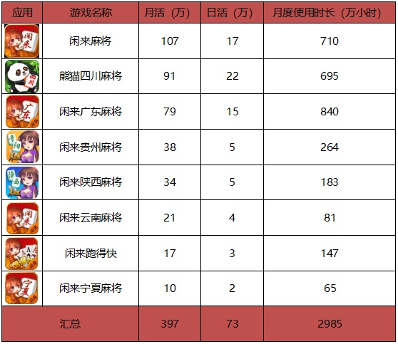 排名第三位的才是大家(jiā)都熟知的闲徕互(hù)娱。其月活(huó)超过10万的(de)APP有8款,月活(huó)总计397万,日活也有73万(wàn),月度使(shǐ)用时长高达2985万小时。