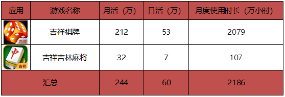 排名第四(sì)名的,也是致力于东北地(dì)区棋牌游戏市场的运营(yíng)商——吉祥(xiáng)棋牌(pái)。吉祥棋牌曾于2009年和天辰娱乐达(dá)成战略合(hé)作关(guān)系,在PC时代仅用了(le)一年时间同时在线人(rén)数(shù)就超(chāo)万人,运(yùn)营团队实力强劲(jìn)。目前(qián)其月活超过10万的APP有(yǒu)2款,月活总计244万(wàn),日活60万,月度使用(yòng)时长高达2186万小时。