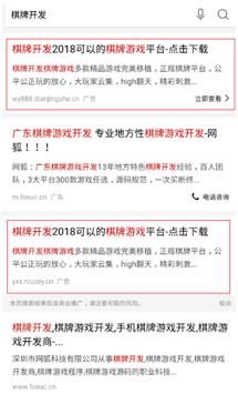 在该推广渠道搜索“棋牌开(kāi)发”除(chú)了(le)天辰娱乐(hú)的广(guǎng)告(gào)外其他两家都是(shì)运(yùn)营商