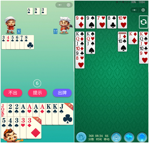 此次(cì)上(shàng)线的(de)小游戏中,共(gòng)有两款棋牌游戏。一款为(wéi)途游游(yóu)戏开发的《富豪斗地主》,一(yī)款为个人开发者开发的《纸牌接龙经典》。前者为网络游戏,后者(zhě)为单(dān)机游(yóu)戏,都是竖版风格。